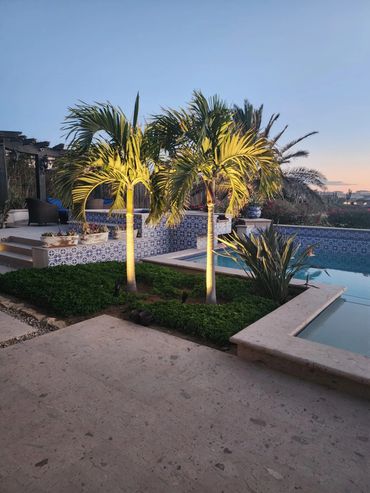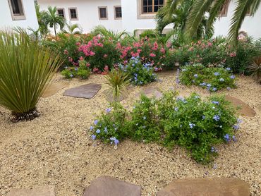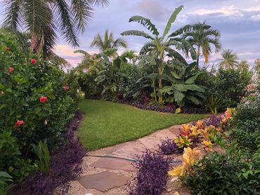 This customer wanted a mix of tropical and desert plants. In the front-yard there are desert plants that are drought resistant and in the back yard there is a tropical paradise complete with a green lawn and fruiting banana trees.