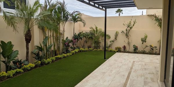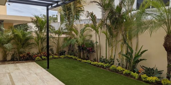 The clients home was new construction the yard was just sand. We completed a landscape design for the client and planted per the specifications of the design. The client wanted a tropical garden with tall privacy plants. The client also required synthetic grass for their pet dog. The entire project from design to completion was done in two weeks to the customers satisfaction.